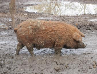 - Crvena mangulica ima čekinje tamnije ili svjetlije crvenkasto – smeđe boje (foto 2). Crveni tip je najmlađi, a nastao je križanjem bijele mangulice sa „szalontai“ i „ujszalontai“ mađarskim svinjama (Ujszalonta je naselje u mađarskoj županiji Békés).