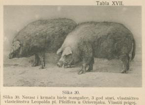 Najkvalitetniji uzgoji mangulice prema Izvješću 1896. – 1906. bili su uzgoji grofa Majlatha u Donjem Miholjcu, grofa Jankovića u Cabuni, grofa Pejacsevicha u Našicama, vlastelina Leopolda pl. Pfeiffera u Orlovnjaku (foto 5), Vase Maučevića u Osijeku te grofa Eltza u Vukovaru. U cilju genetskog unaprjeđenja navedenih uzgoja dopremana su izravno rasplodna grla iz poznatih po kvaliteti uzgoja u Kis-Jenö, Pankoti i Mezöhegyesu. No, kako bi se cjelokupan uzgoj na prostoru Hrvatske unaprijedio, Zemaljska vlada Kraljevine i Slavonije je 1901. godine utemeljila u Kraljevskoj ratarnici u Požegi malu farmu mangulice u tipu reprodukcijskog centra s 2 nerasta i 6 nazimica dopremljenih iz Šumadije, a u svrhu rasploda kasnije su dopremani i nerasti iz uzgoja Kis-Jenö, Donjeg Miholjca i Cabune. Godine 1906. uzgoj u Požegi je brojio 9 nerasta i 40 krmača, no to je bilo premalo matično stado kako bi se zadovoljio interes za nabavkom čistokrvnih mangulica u svrhu rasploda od strane privatnih uzgajivača. Prepreka za povećanje matičnog stada u Kraljevskoj ratarnici u Požegi je nedostatak poljoprivrednih površina za proizvodnju krme. Iz toga razloga Kraljevska ratarnica u Požegi i u idućim godinama i dalje kupuje grla iz Kis-Jenö, Donjeg Miholjca i Cabune, te ih dijelom uvodi u uzgoj, a dijelom prodaje privatnim uzgajivačima u cilju oplemenjivanja populacija domaćih svinja.