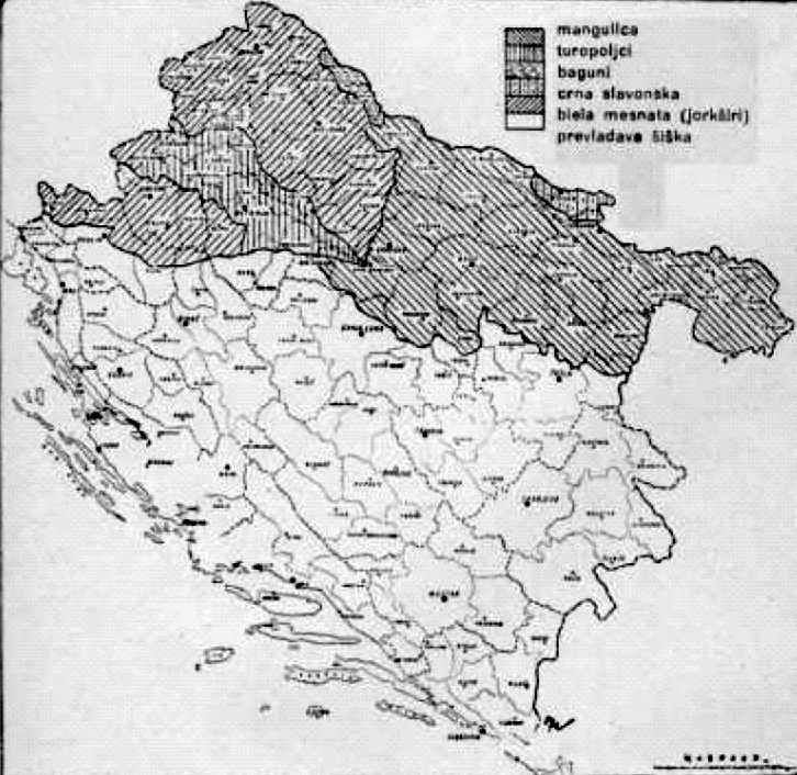 Prema podacima o stanju stočarske proizvodnje 1942. godine u vrijeme Nezavisne Države Hrvatske, nacionalna svinjogojska proizvodnja podijeljena je u dvije glavne skupine, na svinje za proizvodnju masti i svinje za proizvodnju mesa (Pavlinić, 1944). U skupini svinja za proizvodnju masti ubrajaju se domaće pasmine mangulica, turopoljska svinja i bagun koje su činile čak 43% ukupne populacije svinja. U drugoj skupini svinja od 20% za proizvodnju čini najvećim dijelom pasmina jorkšir te manjim dijelom berkšir. Preostali dio nacionalne populacije svinja od 36% čini pasmina šiška i brojni razni križanci, dok crna slavonska svinja ima udio tek oko 1%. U isto vrijeme izražen je na nacionalnoj razini planski proces oplemenjivanja domaćih pasmina s pasminama jorkšir, njemačkom oplemenjenom svinjom, lincoln i drugim plemenitim pasminama te se u tom razdoblju često moglo vidjeti razne križance plemenitih s domaćim pasminama svinja (foto 10). Najveća rasprostranjenost pasmine mangulica bila je na prostoru istočnog dijela Hrvatske.